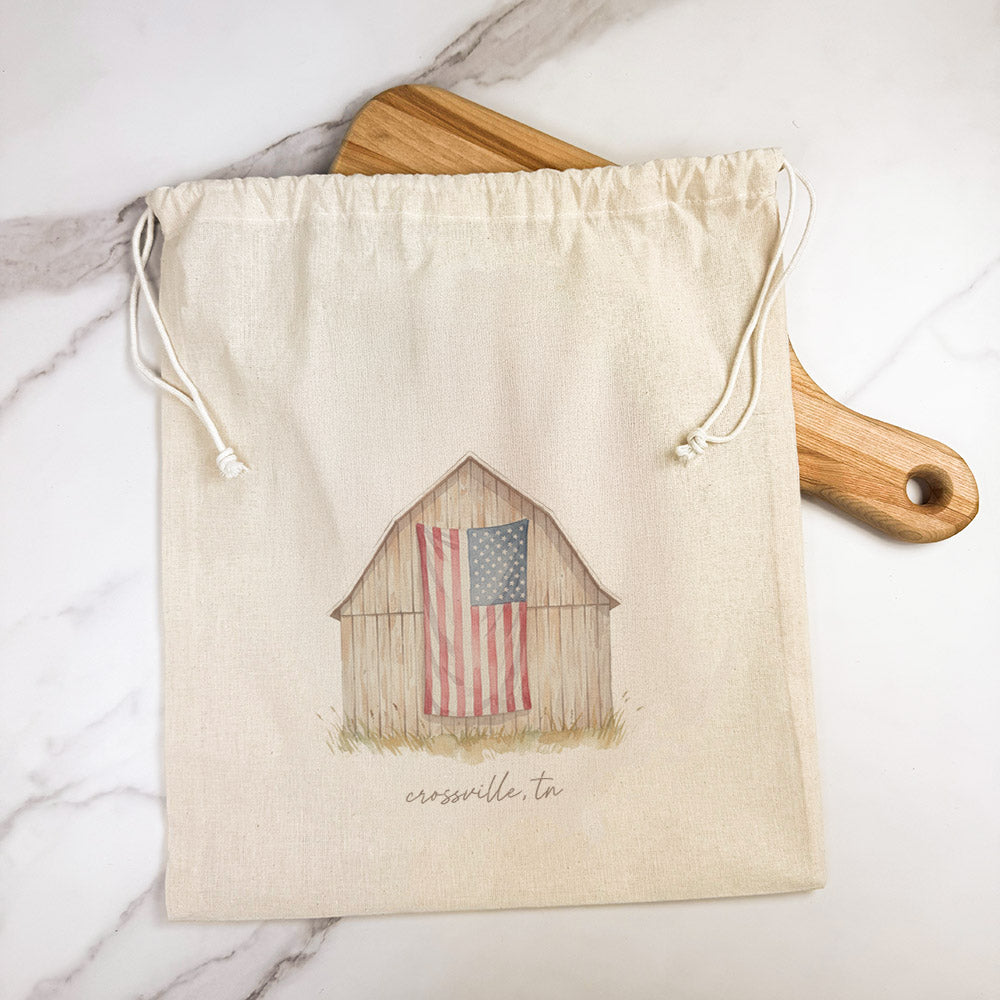 The artwork features a weathered wooden barn with a classic American flag and a customizable city and state location beneath the illustration.
