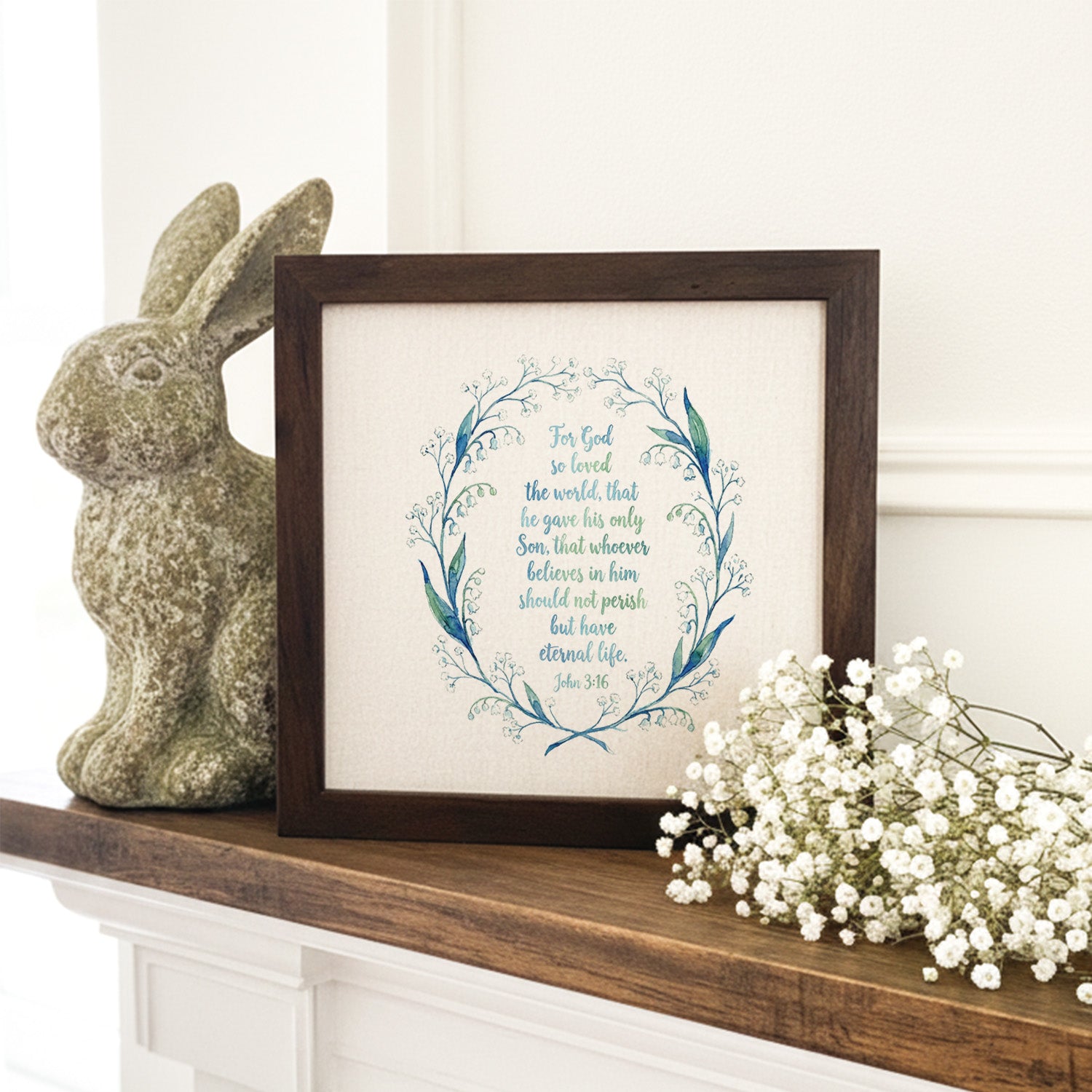 The artwork features the beloved Bible verse John 3:16 arranged inside a delicate watercolor wreath of blue and green botanical stems with small blossoms.