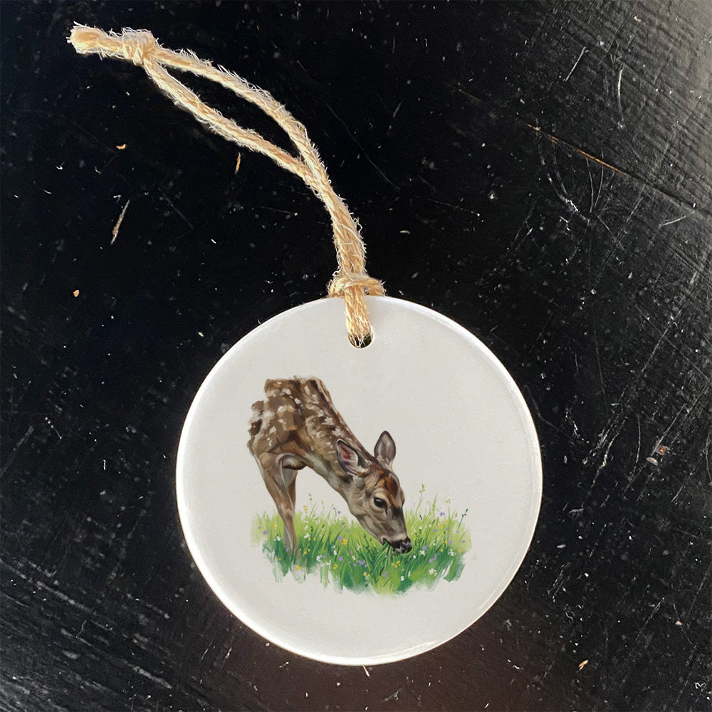 The artwork features a young doe grazing in fresh green grass sprinkled with tiny wildflowers. Warm brown tones, delicate shading, and subtle spotting give the illustration a painterly, storybook quality that feels light and serene.