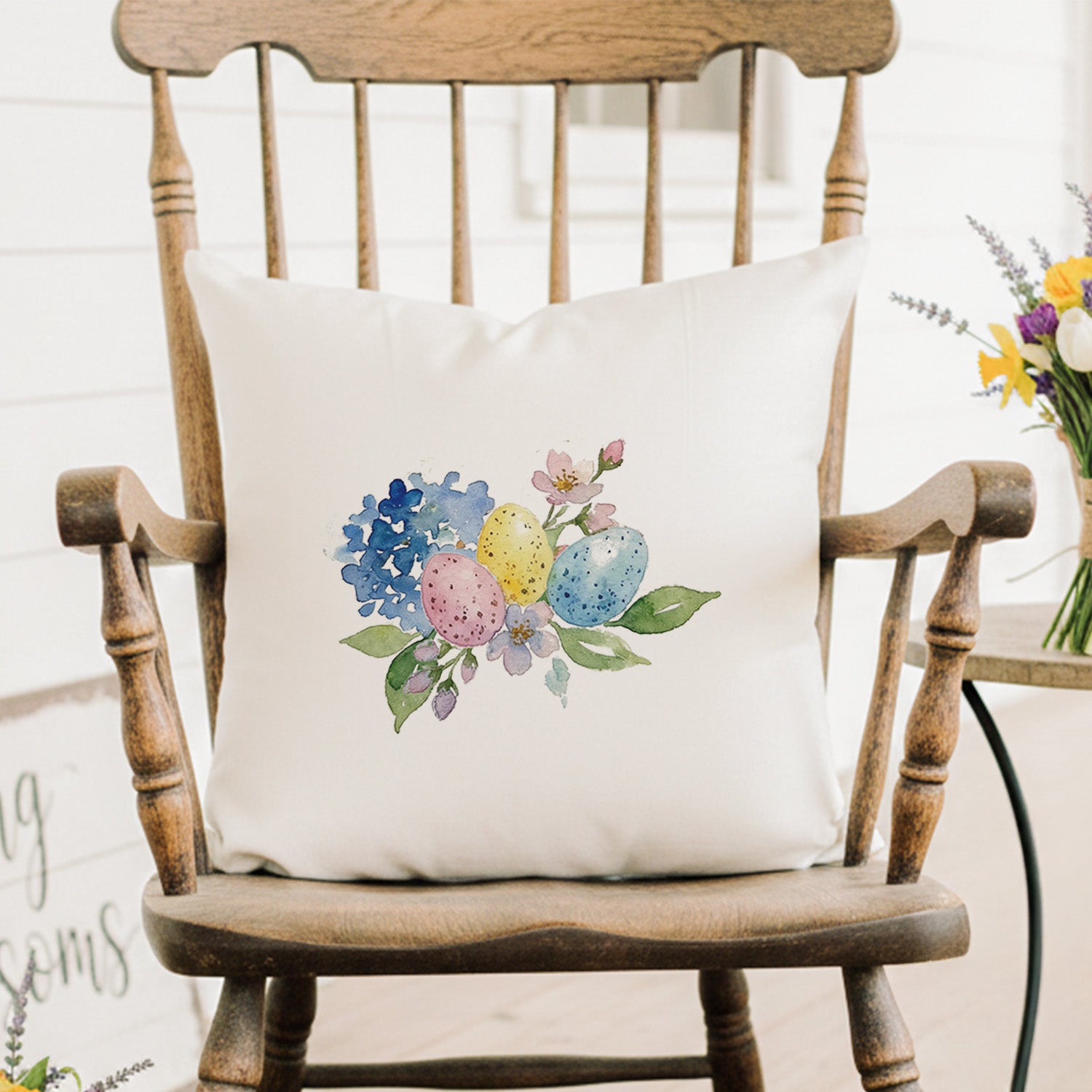 The artwork features three speckled eggs in watercolor pink, yellow, and blue, nestled among a blue hydrangea, delicate blossoms, fresh greenery, and gentle lavender accents for a light, airy seasonal look.