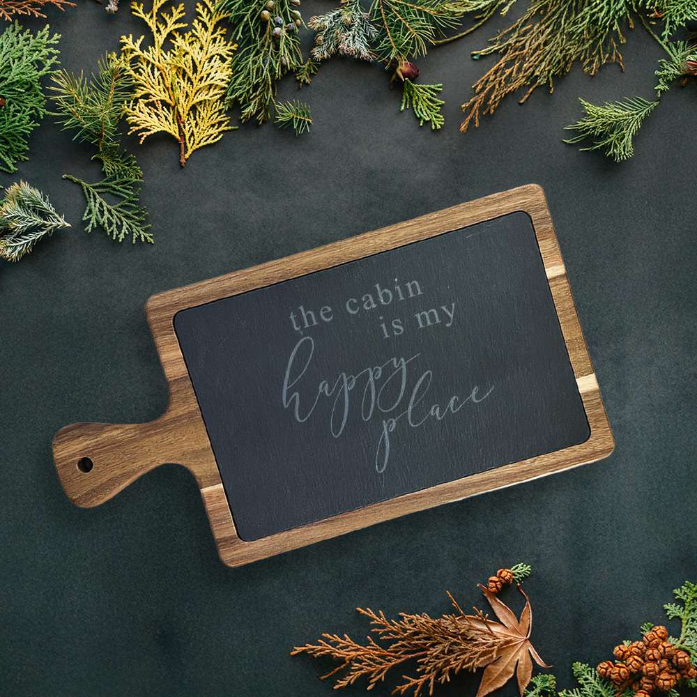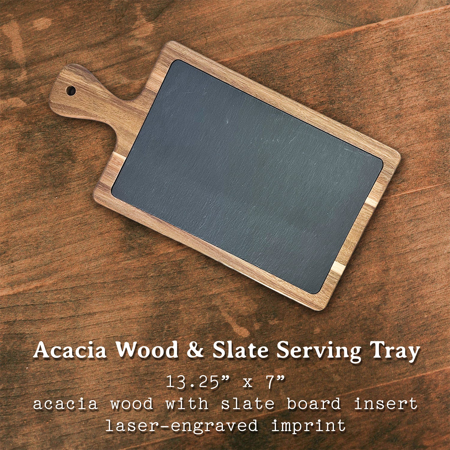 Designed to impress, these slate serving boards combine the natural warmth of acacia wood with the sleek texture of slate. Durable and stain-resistant, they're ideal for charcuterie boards, cheese platters, small bites or a thoughtful housewarming gift. A beautiful and functional display piece for any kitchen or gathering. Hand wash only.