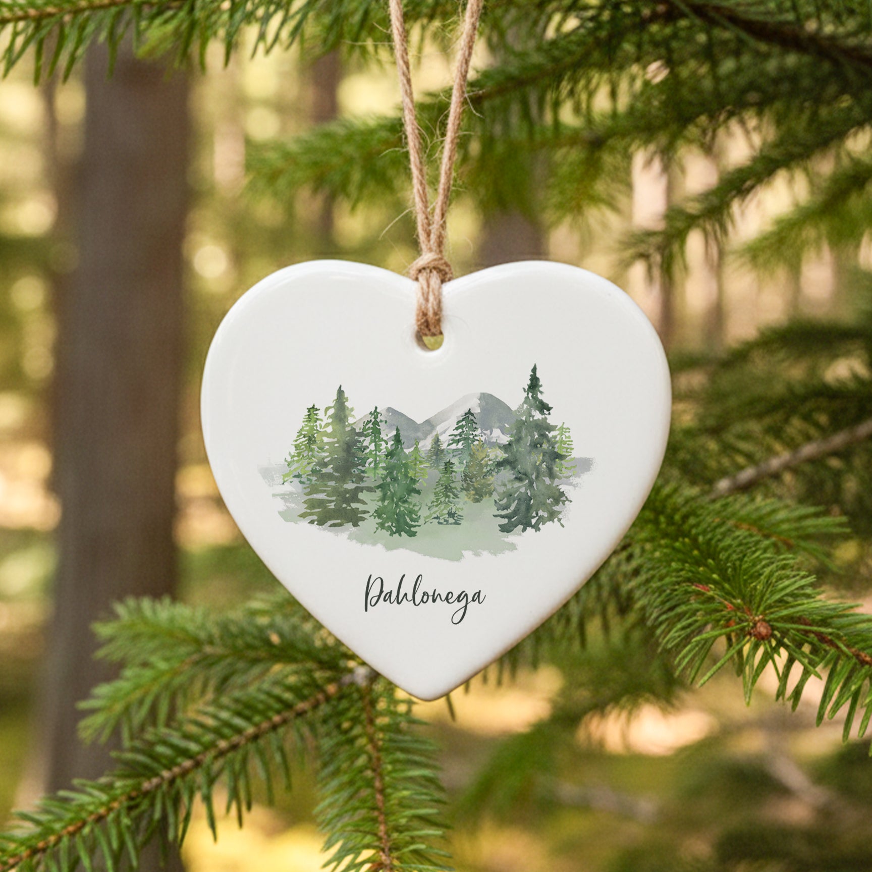 Capture the peaceful beauty of the mountains with this custom watercolor landscape heart shaped ornament. Featuring soft evergreen trees layered in front of misty mountain peaks, this design brings a calm, nature inspired touch to your holiday decor. Personalized with your city name, it becomes a meaningful keepsake that celebrates a favorite hometown, vacation spot, or mountain getaway.